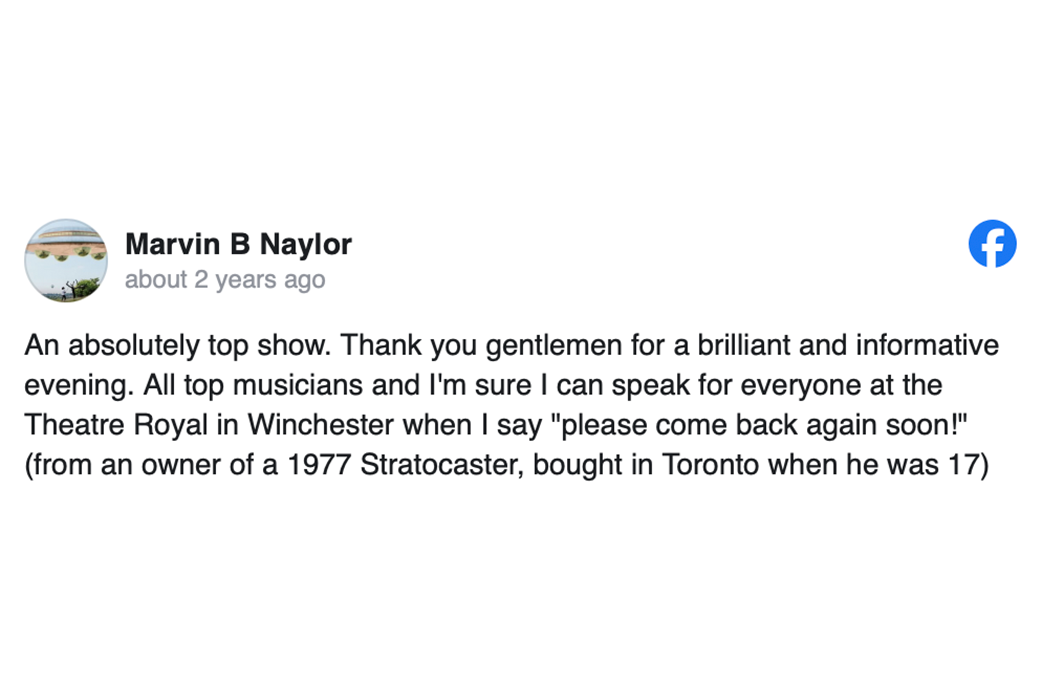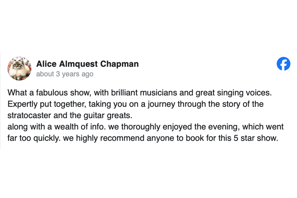 tells the fascinating story of the iconic 🎸 Fender Stratocaster 🎸across the 5 most important decades in its almost 70 Year history. This innovative, live, and commercial show takes audiences through the incredible story of how the world's most recognisable guitar became the iconic instrument we all know and love - told through the songs and the players that made it such an important staple of modern music making.
